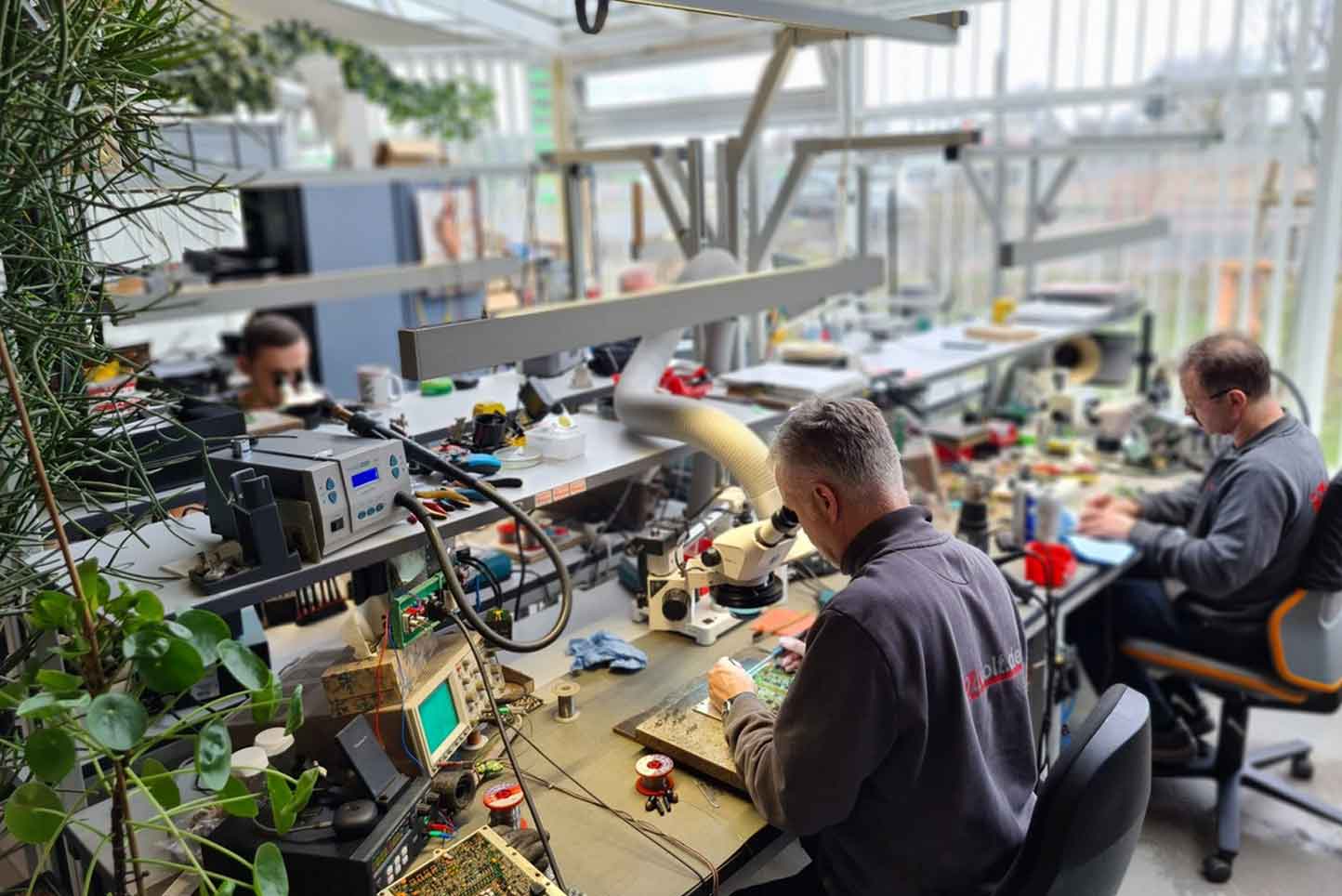 Steffen: … alles, was Räder hat und über diese Betriebsspannung läuft. Daher der Firmenname. Das sind zum Beispiel Motorsteuerungen oder zentrale Bordcomputer und vieles mehr. Mittlerweile machen wir auch Feinmechanik: ABS-Modulatoren zum Beispiel oder Getriebesteuergeräte.